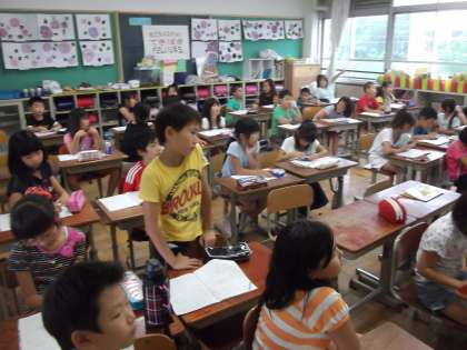 算数の時間に時計を使って「時間」についての学習をしています。