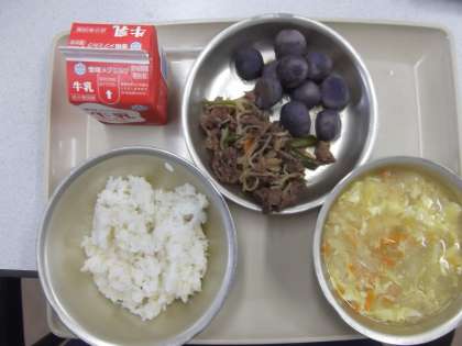 今日の献立は,「玄米ご飯」「キャベツのかきたまじる」「牛肉のしぐれに」「さといものにつけ」「牛乳」です。行事献立,『月見』・・今年の月見(十五夜)は,9月8日です。この日の満月を「中秋の名月」といい月がとてもきれいに見えます。月見には,すすきをかざり,だんごや里いもなどをそなえて豊作を祝います。里いもがこの時期にたくさんとれるので「いも名月」とも言われます。今日は,月見にちなんで「里いもの煮つけ」を食べます。