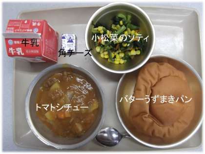 今日の配膳画像は,「バターうずまきパン」と「トマトシチュー」の位置が反対になっていました。連日ごめんなさいです。