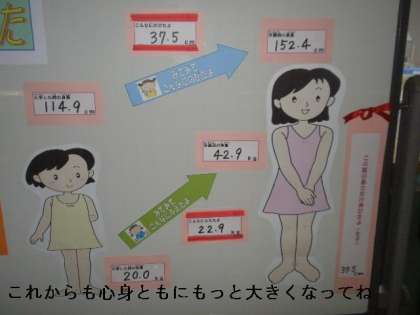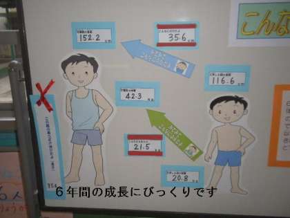 保健室前のローカに6年生の成長記録がはり出されています。1年生入学した時の平均身長と体重と卒業前の現在の身長と体重の比較を男女別で掲示されています。