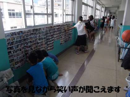 修学旅行の写真がはりだされました。みんな朝休みに運動場に出ずに,思い出の写真を見ています。