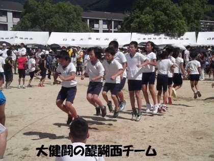 他校は6年生チーム,でも醍醐西チームは4年〜6年の混成チームです。練習では30数回しかとべていなかったのですが,本番ではなんと最高記録の52回をとぶことができ第6位に入りました。第5位のチームが53回,第3位のチームが68回であったので,わずかの差の第6位でした。