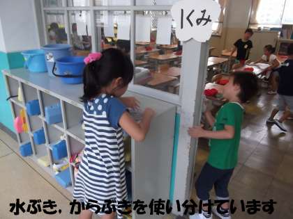 そうじの時間のチャイムがなれば,みんなで教室のそうじをはじめます。きちんと割り当てられた分担をしっかり守って取り組めています。