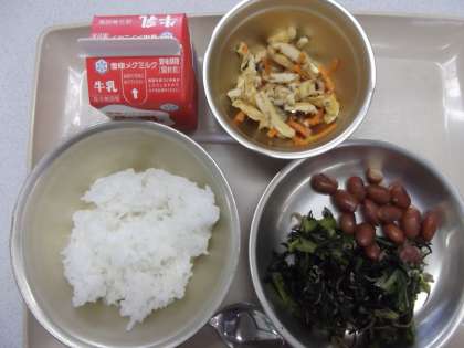 今日の給食の献立は,「ご飯」「こぎつねちらしのぐ」「こまつなとひじきのいためもの」「きんときまめのあまに」「牛乳」です。こぎつねちらしのぐをご飯に混ぜていただきます。さっぱりといただきました。ごちそうさまでした。