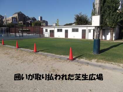 昨日,芝生広場の囲いが取り払われました。運動場と芝生広場のコントラストがきれいです。