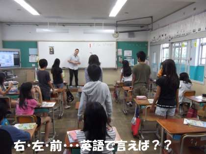 ALTの先生の指示で,左向いたり,回ったり・・・。しっかりヒアリングしなければ間違ってしまいます。先生や友だちにつられないように,耳をダンボにしてがんばっていました。