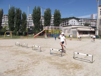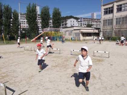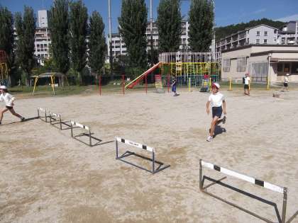 体育の時間で運動会に向けて「ハードル走」の練習をしていました。初めは,リズムよく跳べませんでしたが,後半になると上手に跳べるようになりました。
