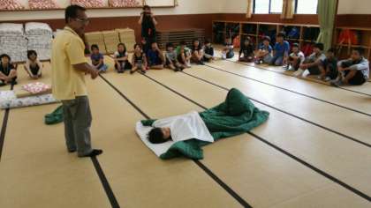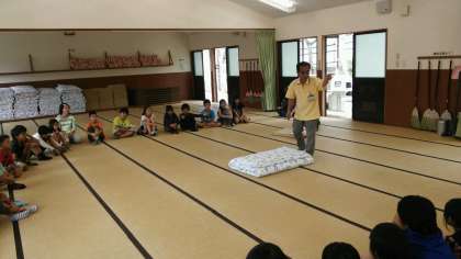 お腹がいっぱいになったあとは、オリエンテーションです。みさきの家の所員さんに寝袋やシーツのしき方を教えてもらいました。今日はテント泊です。これからテントサイトに移動して、寝具準備をします。