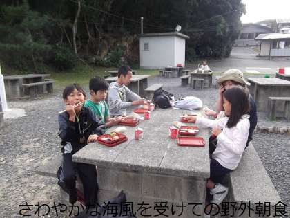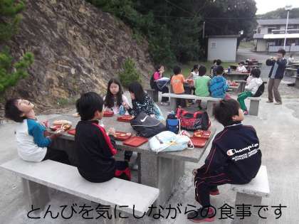 配ぜん中,ハプニングが起こりました。配っていたパンを「トンビ」が一瞬でかっさらっていきました。みんなびっくり!それから空を見上げながらの朝食になりました。(予備のパンがあったので事なきをえました)