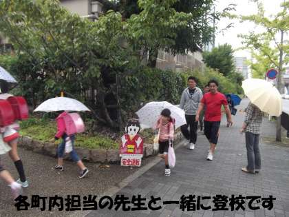 台風18号の影響で,2時間遅れの登校になりました。今日は,各町内担当の先生が集合場所から一緒に登校しました。