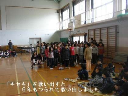 4年生はリコーダー演奏をBGMにして6年生へのメッセージは雰囲気がでてバッチリ!6年生のために選んだ合唱曲は「キセキ」です。歌い出すと他の学年の子どもたちの一緒に歌い出しました。