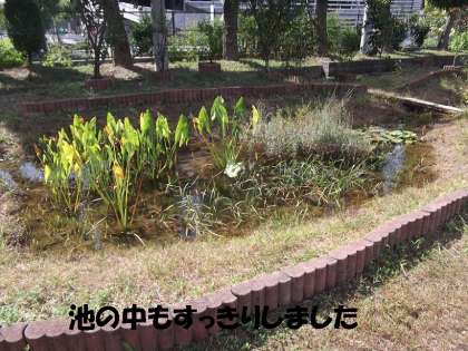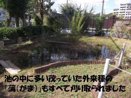 ビオトープは,芝生化されてきれいになった広場と隣接しているため,今夏に荒れ放題になって気になっていたのですが,9月下旬から10月上旬にかけて,地域の浦上さんが雑草や池の中の整備をしてくださいました。