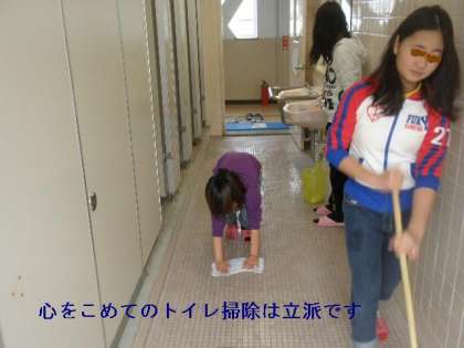 掃き掃除と手洗い場のそうじがノルマなんですが,同じするんだったら徹底的にしようとがんばってくれています。中には便器をブラシでごしごし磨いたり,床をぞうきんがけしたり・・・。