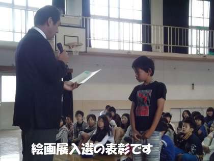始業式の後,全市部活動バレーボール交流会でがんばった6年生チームと絵画展で入選賞をもらった4年生の表彰式が行われました。