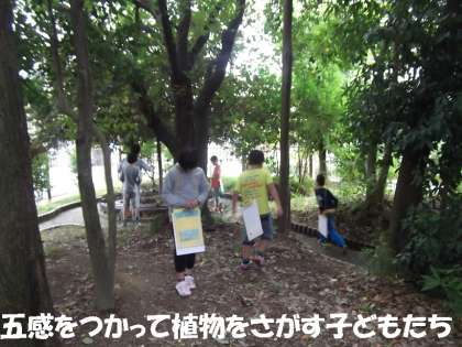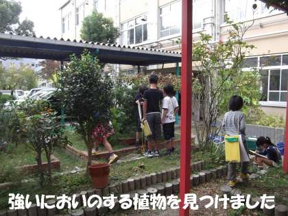 今日は,五感(視覚、聴覚、触覚、味覚、嗅覚)使って校内の植物を観察したあと,テーマをしぼってグループで話し合い活動(ブレインストーミング)をしました。