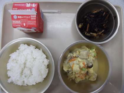 今日の給食の献立は,「ごはん」「こうやどうふのたまごとじ」「ひじきのにつけ」「牛乳」です。食品紹介「高野どうふ」・・・「高野どふう」は,うすく切ったとうふを凍らせてから乾燥させたものです。和歌山県の高野山でおぼうさんが作りはじめたことからこの名前がつきました。「しみどうふ」「こおりどうふ」ともよばれています。