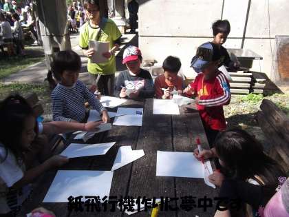 着くと同時に開会式がはじまりました。そのあと,お昼まで,「紙飛行機コーナー」「大なわとびコーナー」「グランドゴルフコーナー」の分かれて楽しみました。
