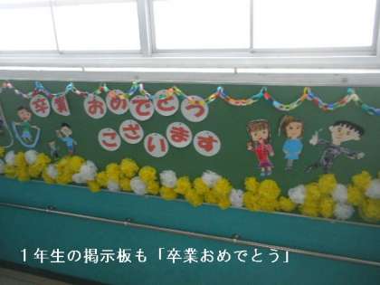 南校舎1階〜2階の階段の掲示板も「卒業おめでとう」コーナーに変わりました。1年生が自分たちで花飾りを作ったり絵を描いてくれました。
