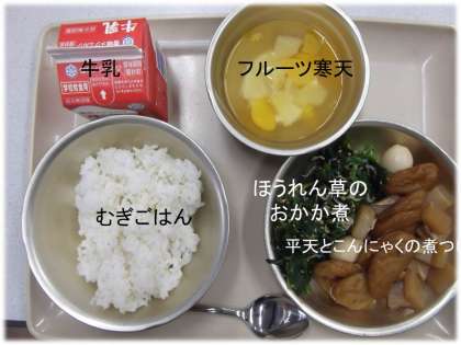 「むぎごはん」「平天とこんにゃくの煮つけ」