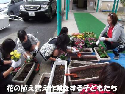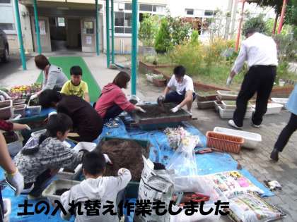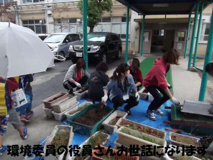 委員会活動の時間(6校時)にPTA環境委員の役員さんが中心となって,環境委員会の子どもたちと一緒に,玄関前のプランターの花の植え替え作業をしていただきました。