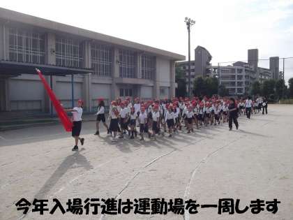 1,2校時を使って運動会の全校練習を行いました。今年から入場隊形が変わります。子どもたちは運動場を一周します。そのため,入場行進を中心に練習しました。