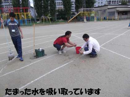 昨夜の雨で,せっかく引いた白線も消えてしまい,運動場のあちこちの水たまりができていました。