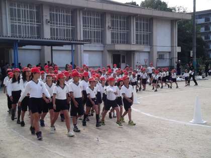 運動会が予定通りはじまりました。子どもたちは,赤組・白組に分かれて堂々と入場しました。