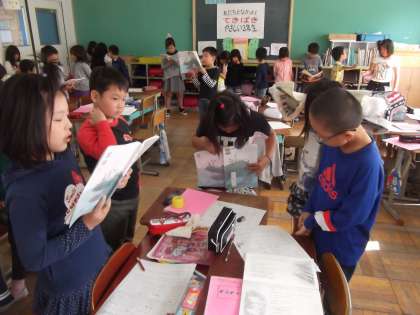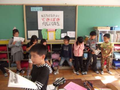 国語の時間に「ちいちゃんのかげおくり」を学習しています。今日は,物語を読みながら動作化をしたり,その場面の再現をしたりしていました。