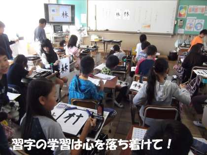 書写の時間に習字「林」を書きました。一字の漢字で,しかも左右が同じ字です。でも,それがなかなか難しく,形を整えるのに苦労していました。