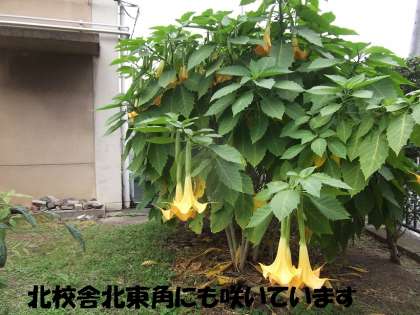 玄関前の中庭花壇と北校舎北東角に咲いています。