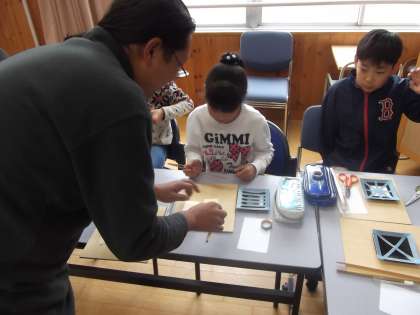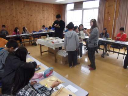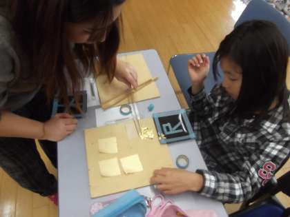 今日は,金箔貼り体験を行いました。仏具協会の方から金箔の貼り方を教えてもらい金箔貼りに挑戦。なかなか思うように金箔が貼れなくて苦労しているようでした。