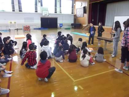 6年2組は,今日から「スマイルプロジェクト」を始めました。このプロジェクトは,低学年と中間,昼休みなどに,一緒に遊び楽しく笑顔で過ごすことを目的にしています。第1回目は,2年1組のお友だちと遊びました。