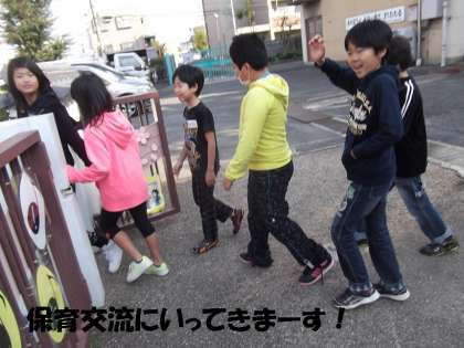 1〜3年生が遠足に出発したあと,5年生は,中山保育園に保育交流(総合学習)に出発しました。