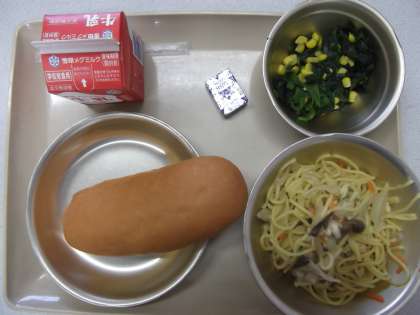 今日の給食の献立は,「こがたコッペパン」「きのこスパゲティ」「ホウレンソウのソティー」「牛乳」「かくチーズ」です。