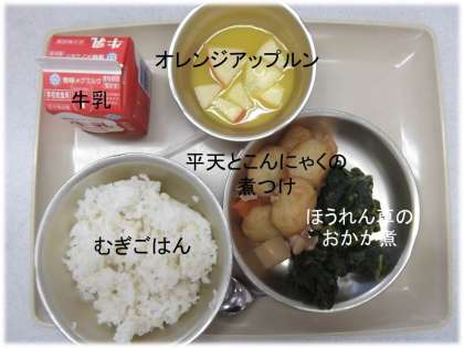 「むぎごはん」「平天とこんにゃくの煮つけ」「ほうれん草のおかか煮」