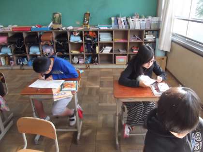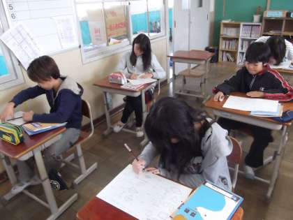 6年2組では,算数の復習のプリント学習をしていました。みんな集中してプリント学習ができました。