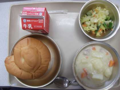今日の給食の献立は,「バターうずまきパン」「じゃがいものクリームシチュー」「アスパラガスのソテー」「牛乳」です。