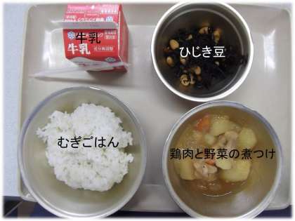 「むぎごはん」「鶏肉と野菜の煮つけ」「ひじき豆」「牛乳」