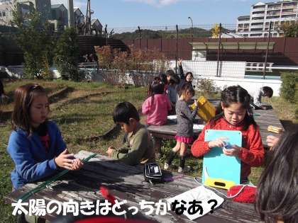 太陽は,どこから上って,お昼には東西南北のどこに見えるだろう??みんなで予想していました。