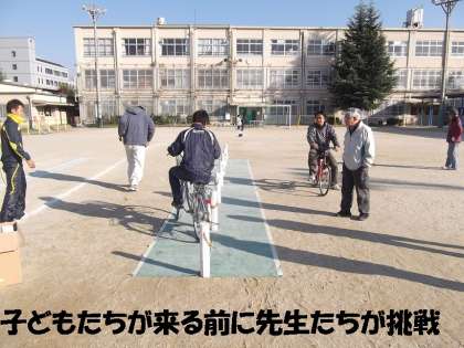 山科警察署の方から,自転車の安全な乗り方のお話を聞いたあと,実技に挑戦しました。