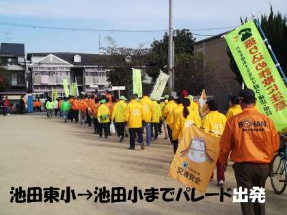 9時30分,10校区から約450名のみなさんが集まり,予定どおり開会式が行われ,池田小学校に向けて,パレードを開始しました。