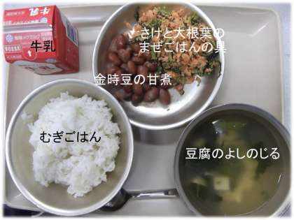 「さけと大根葉のまぜごはんの具」「金時豆の甘煮」「牛乳」