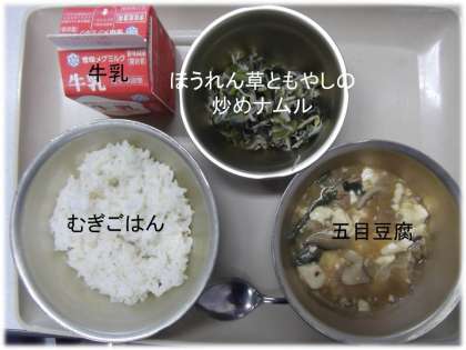 「むぎごはん」「五目豆腐」