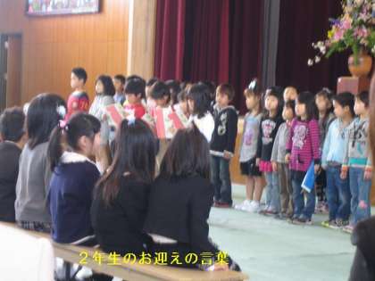 入学式後,1年生の教室に入ってからも,お行儀よく担任の先生のお話を聞いていました。お迎えのことばも,2年生の子どもたちが,大きな声で言ってくれました。