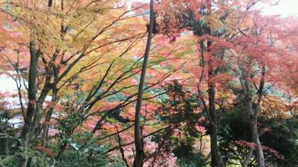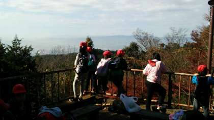 山頂では、町中よりもさらに紅葉が進んでいてきれいです。少しもやがかかっていますが、大阪方面の景色も抜群です。これから、下山します。