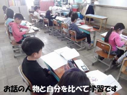お隣の教室では,国語の読み取り学習をがんばっていました。お話の中に出てくる人物と自分を比べながら読み取り,小見出しを考えました。