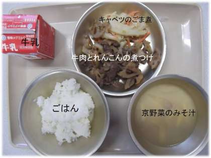 「牛肉とれんこんの煮つけ」「牛乳」