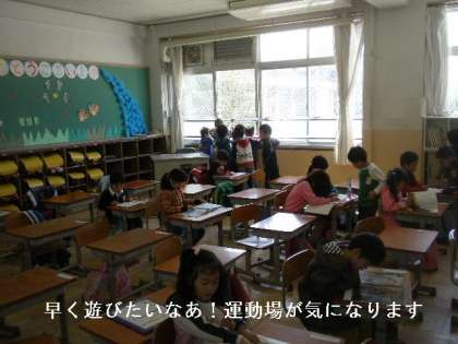 1年生は,早く広い運動場で遊びたくてしかたがないようです。窓から運動場を見ています。1年生の外遊びは「遊びのきまり」を習ってからです。もう少しがまんです。