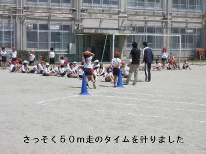 4年生も合同体育をしました。最初に新体力テストで50m走のタイムを計りました。
