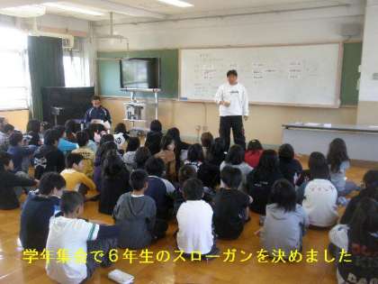 4校時に学年集会をしました。今年の6年生のスローガンは??みんなで一生けん命考えました。醍醐西のリーダーとして模範になってくれると期待しています。